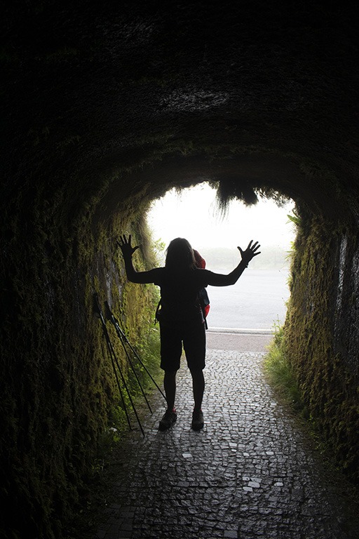Tam, kde se ještě včera tyčila majestátní hora není nic. Jen hustá mlha. Vaříme kávu, snídáme ovesnou kaši…brrrrr… a doufáme, že se počasí cestou na Caldeiru vylepší. Povedlo se! Celou cestu od moře po vrchol hřebenu slunce peče. Vedro, brutální vlhkost, pot se z nás valí. Během obědové pauzy začíná pršet…Pevně doufáme, že je to jen přeháňka a počasí se vybere. Mžení nás průběžně skrápí až do parku Cabouco, který je perfektně vybavený. Čisté záchody, pitná voda, kryté sezení. Doplňujeme tekutiny, myjeme nádobí od oběda a za jemného mžení nastupujeme na cca 5 kilometrové prudké stoupání na okraj sopky. Jemný deštík nás příjemně chladí do doby, než se k němu přidá mlha a prudký vítr. Počasí pod psa během mžiku. Serpentiny na vrchol se zdají být nekonečné. K našemu údivu se z přítmí vynořuje běžec, kývne na pozdrav a mizí v husté mlze.